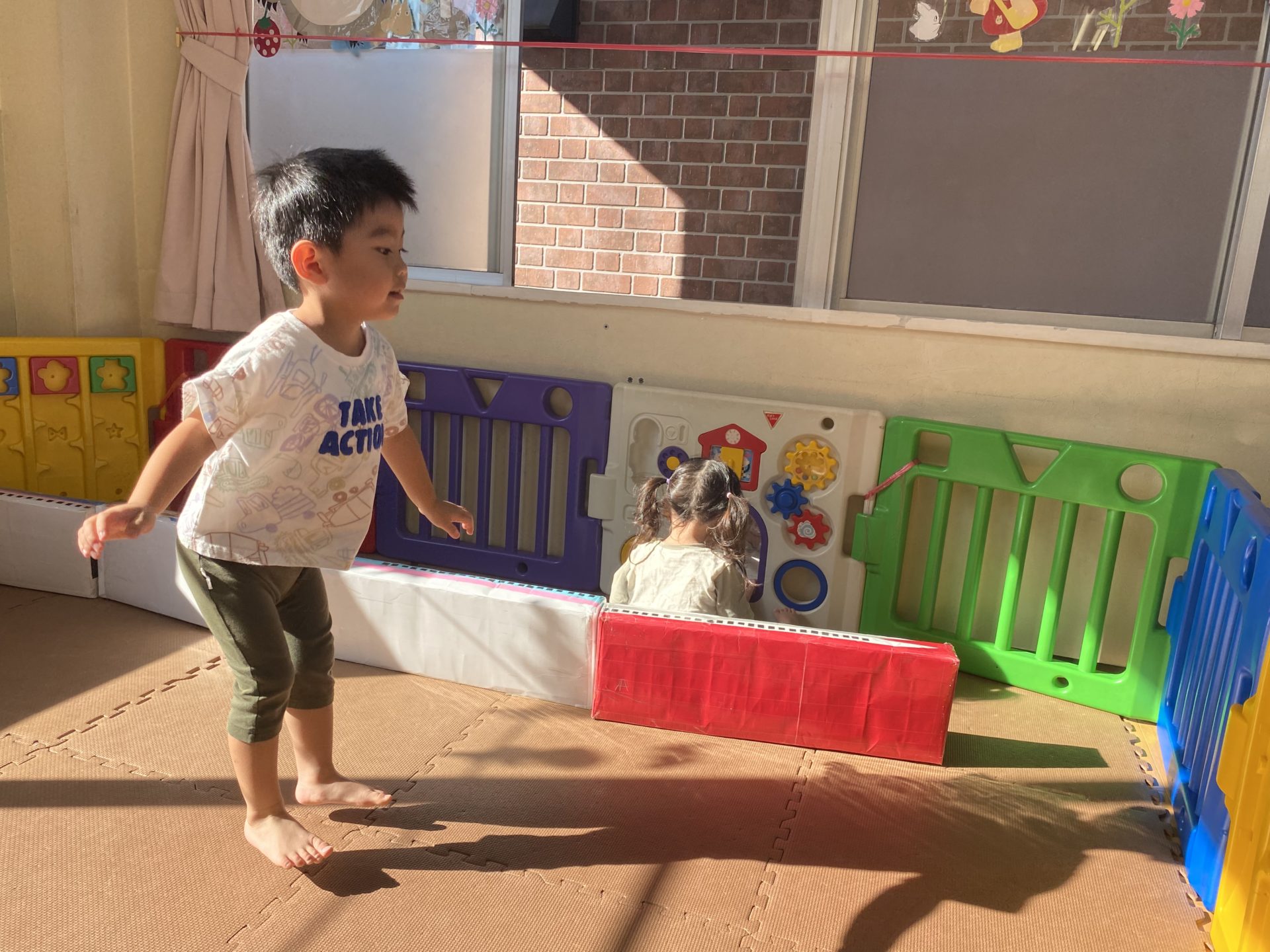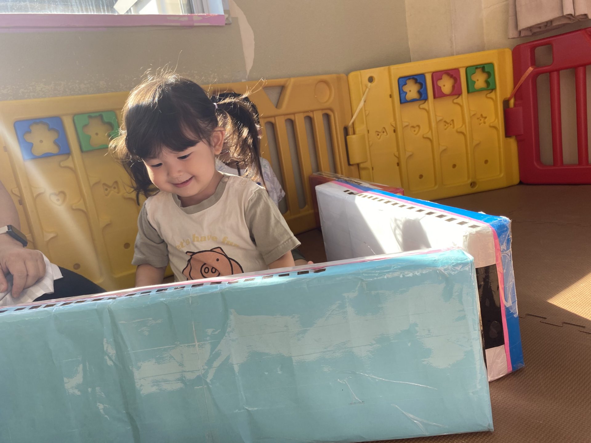 朝は段ボール電車で遊びました。乗ったり 囲いにしたりしましたよ。