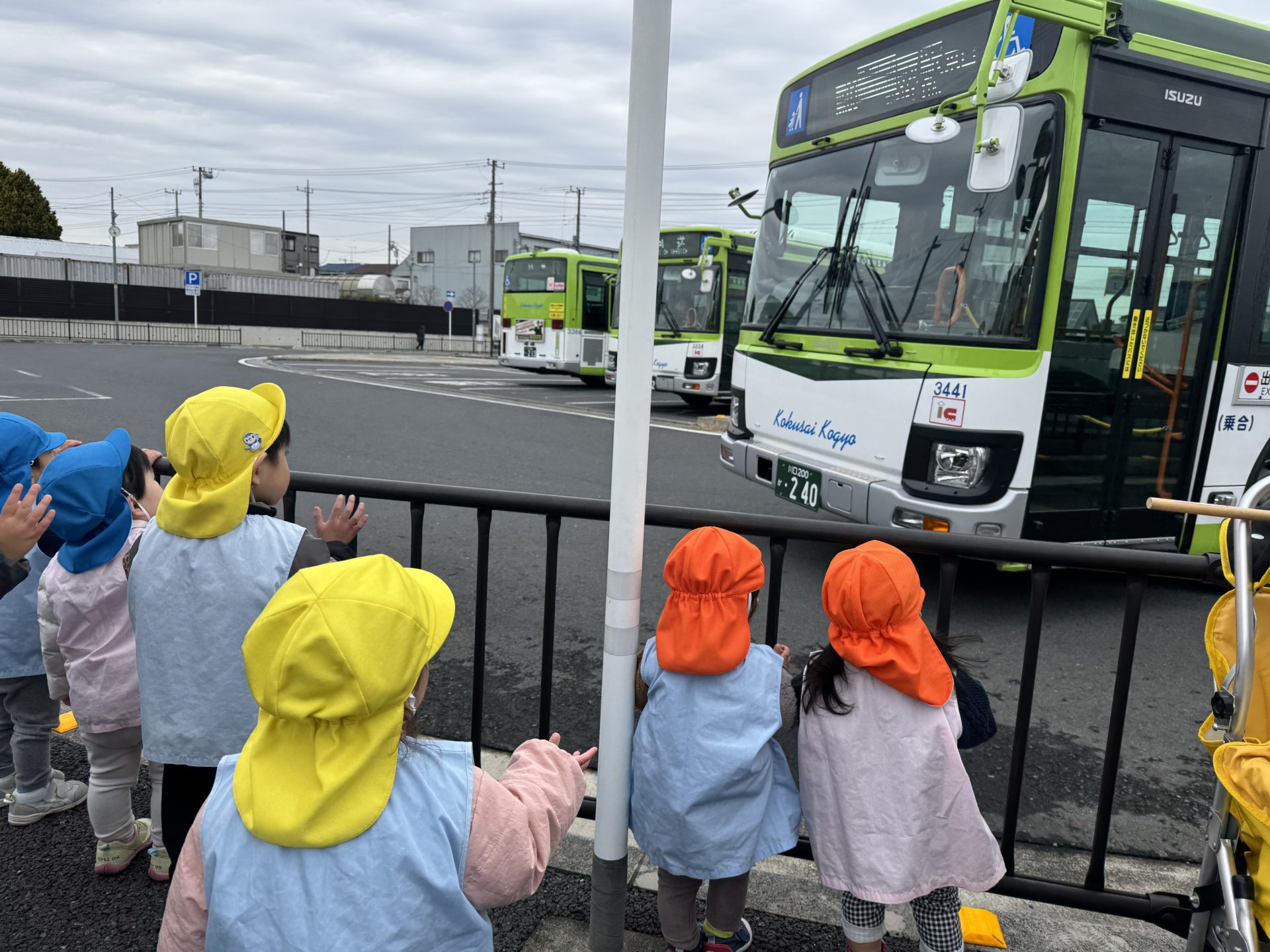 到着したときには、ちょうど発着ラッシュでたくさんのバスがいて、運転手さんがたくさん手を振ってくれて、大喜びのこどもたちでした😊