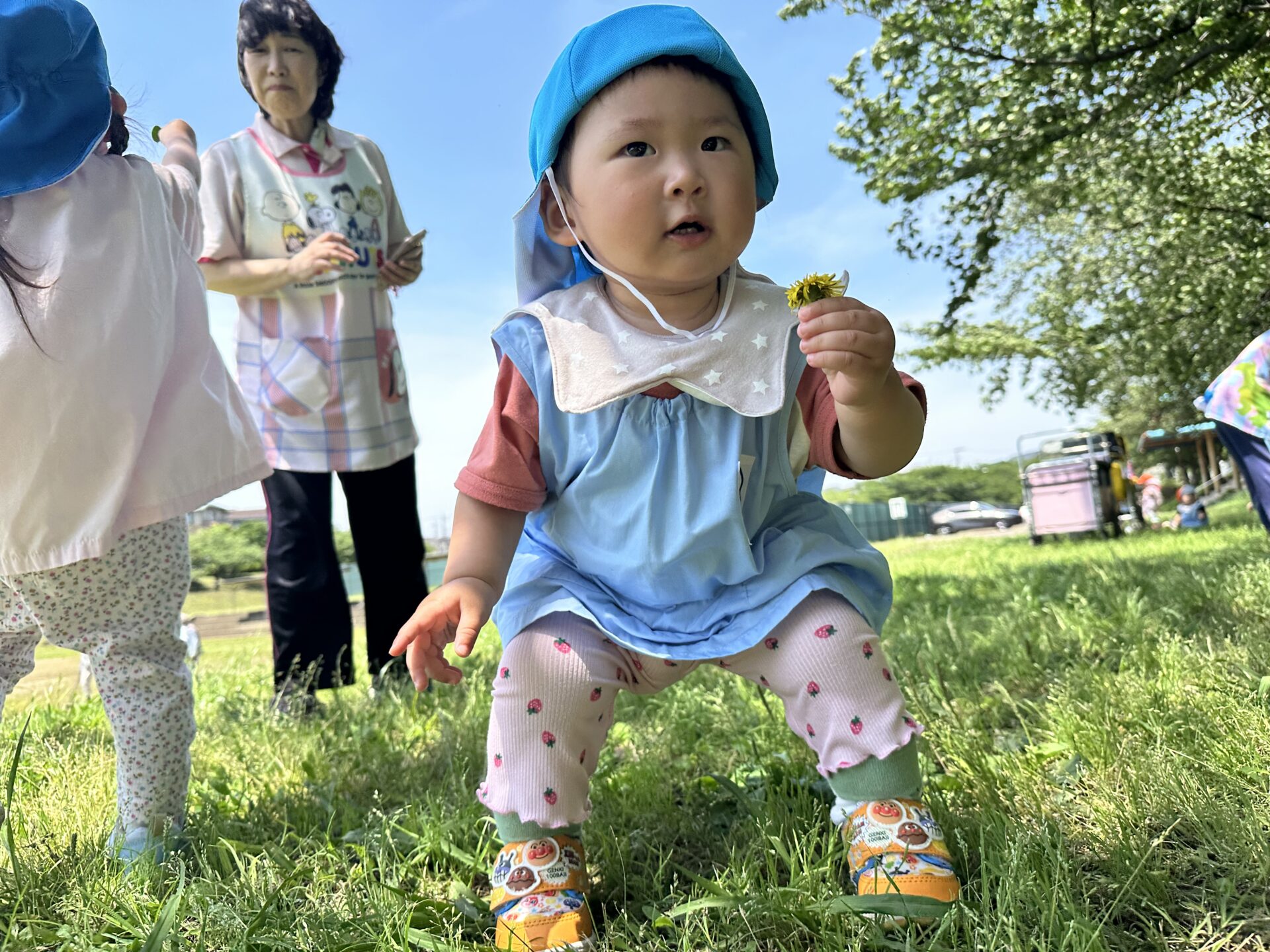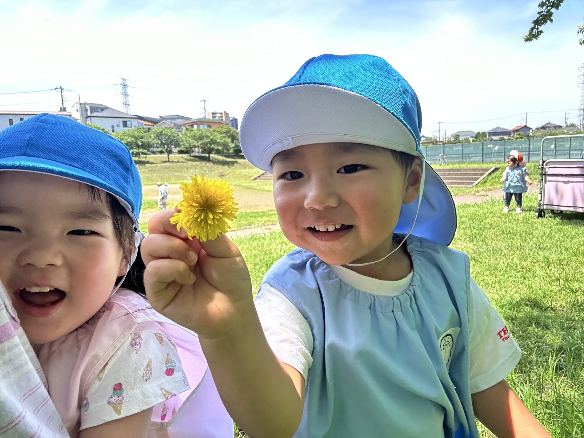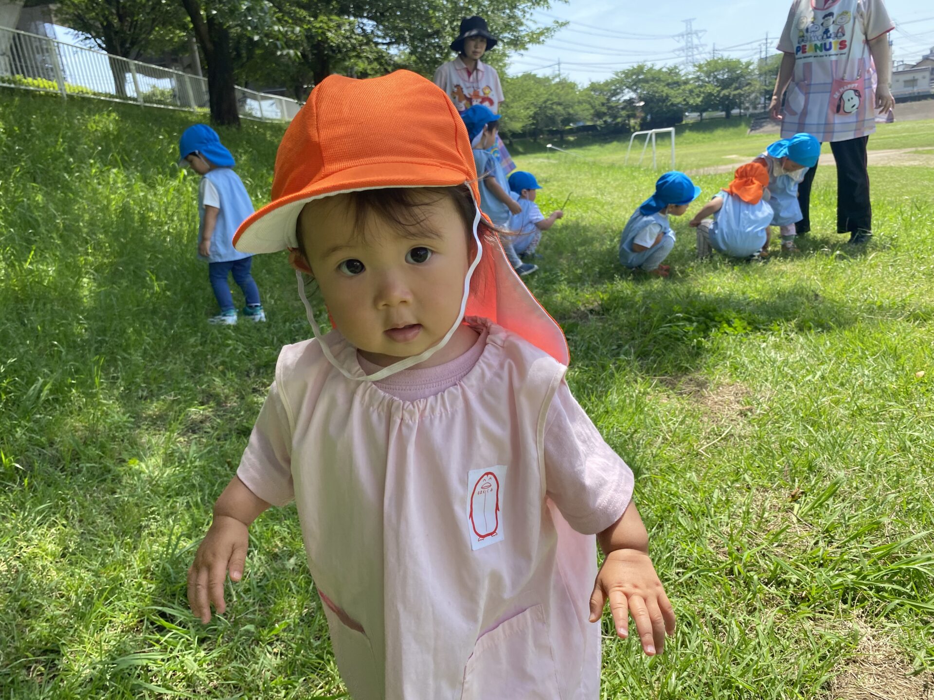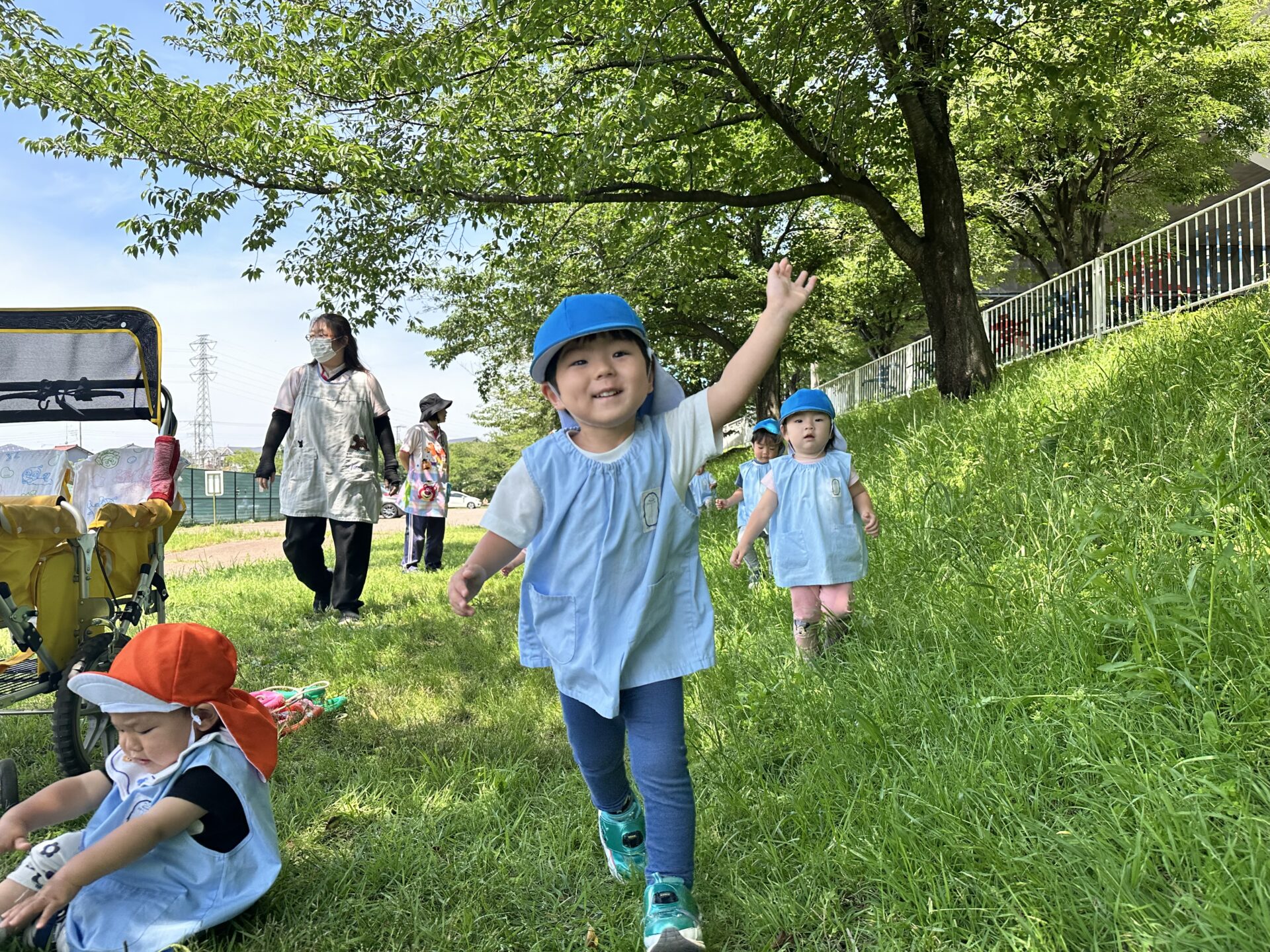 今日も気温が上がる予報でしたが、近くのグランドで涼しい木陰を見つけそこでお花や、蝶々、あり等次々に発見!!「見て見て〜🤗」と楽しんだでいた子ども達です✨
