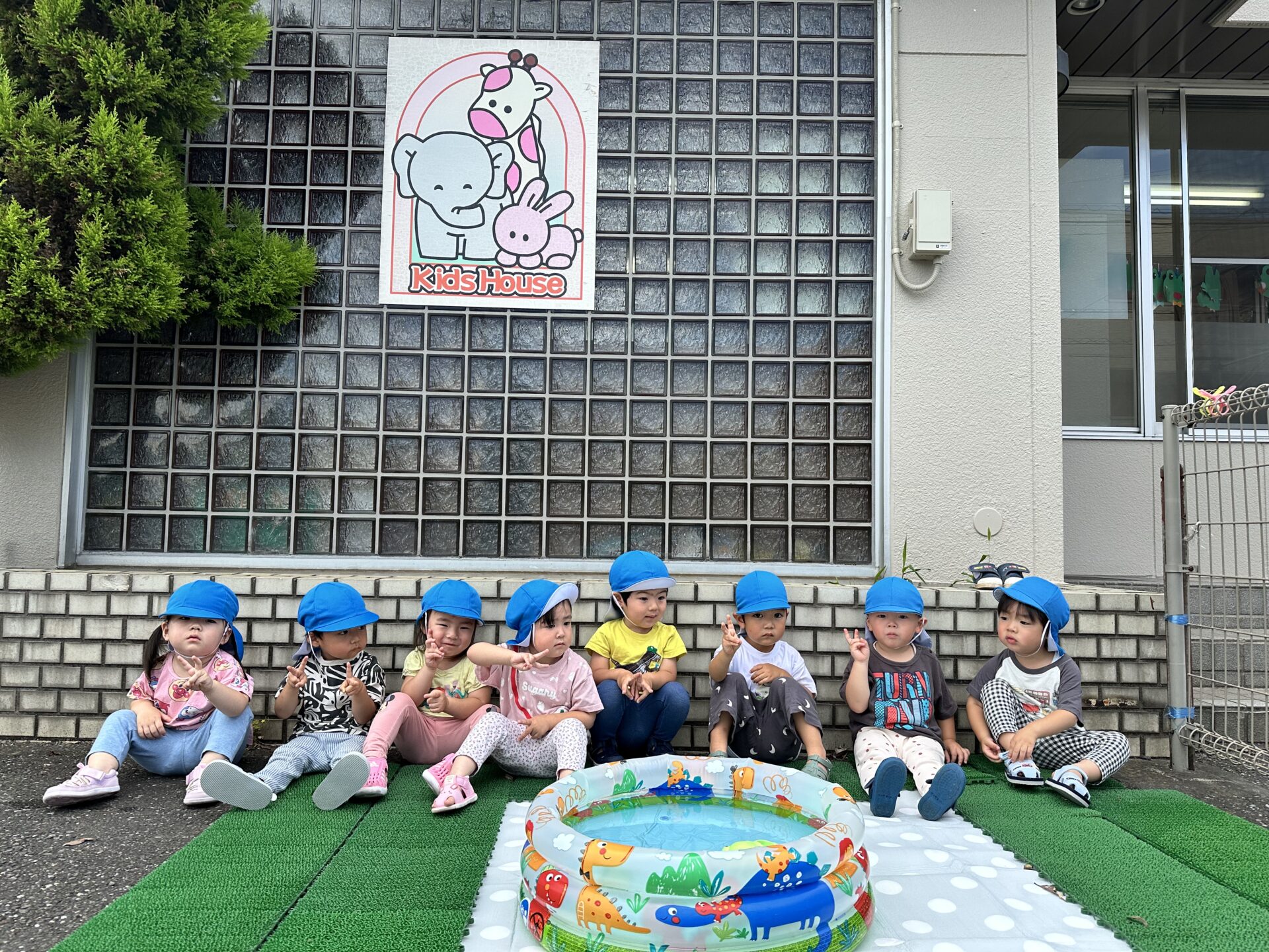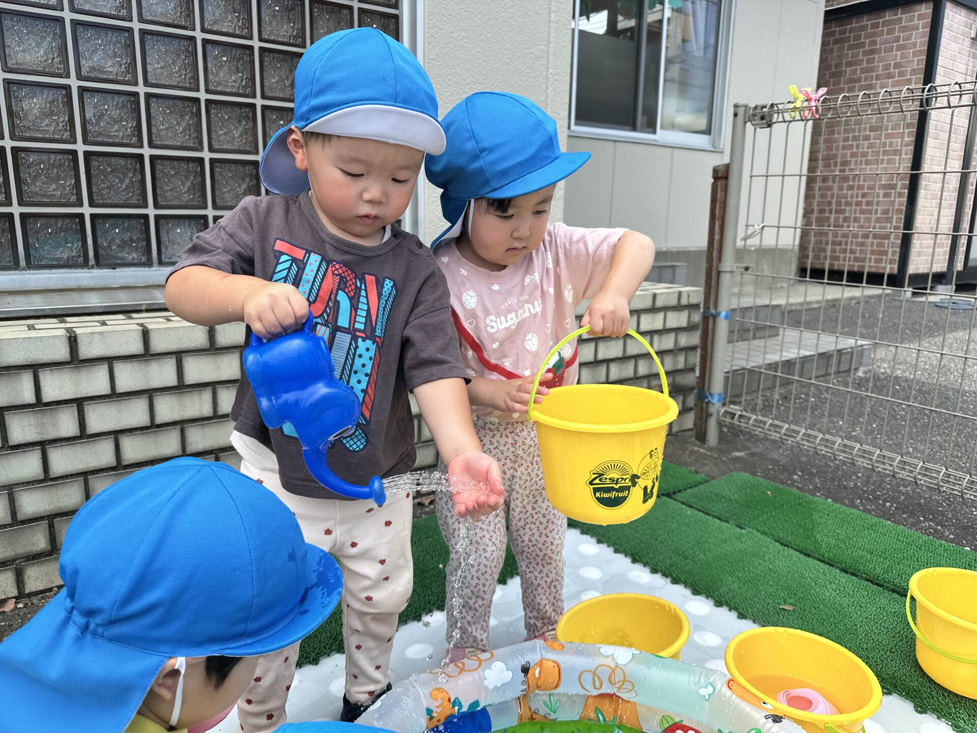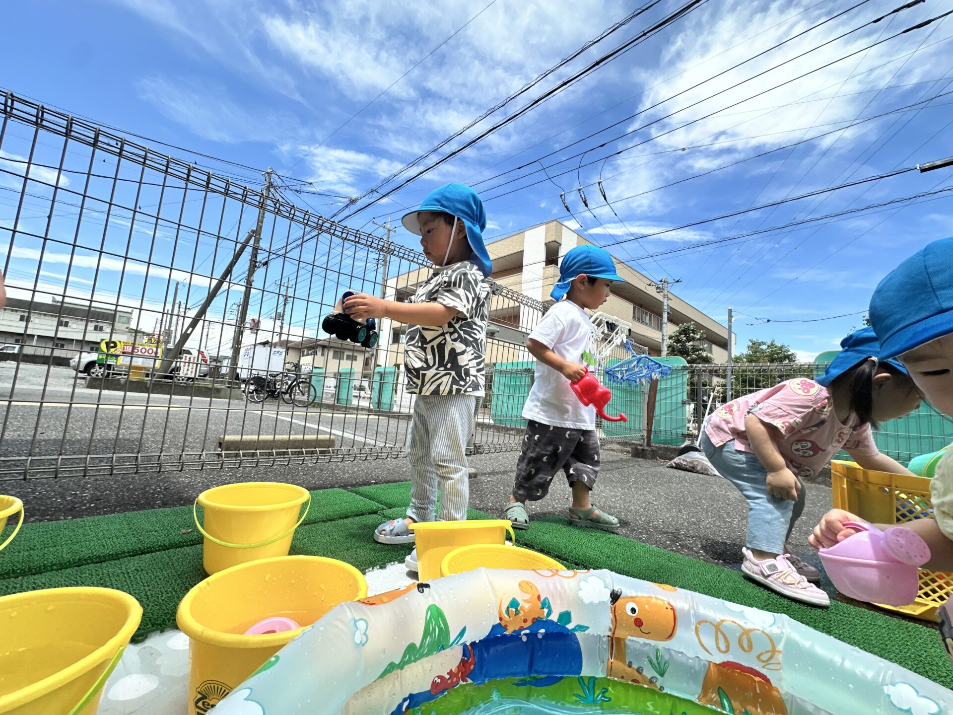 少し風があったのですがひよこ組うさぎ組さんは、水遊びをこあら組組さんは、英語をやった後に水遊びをしました😆
