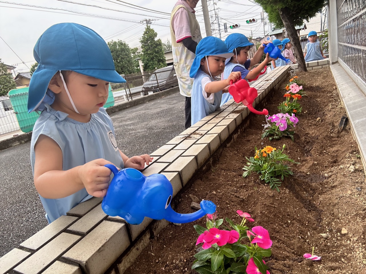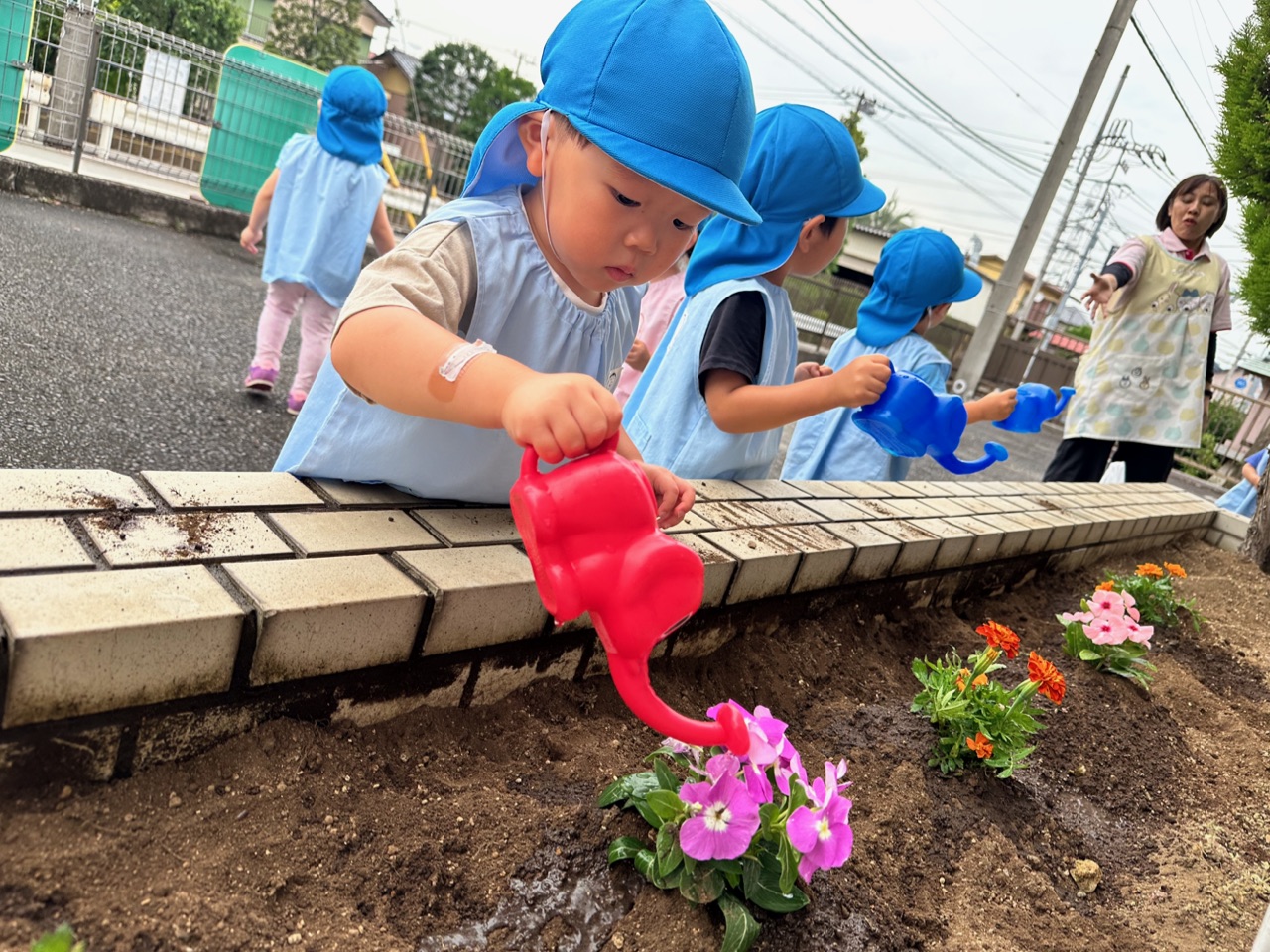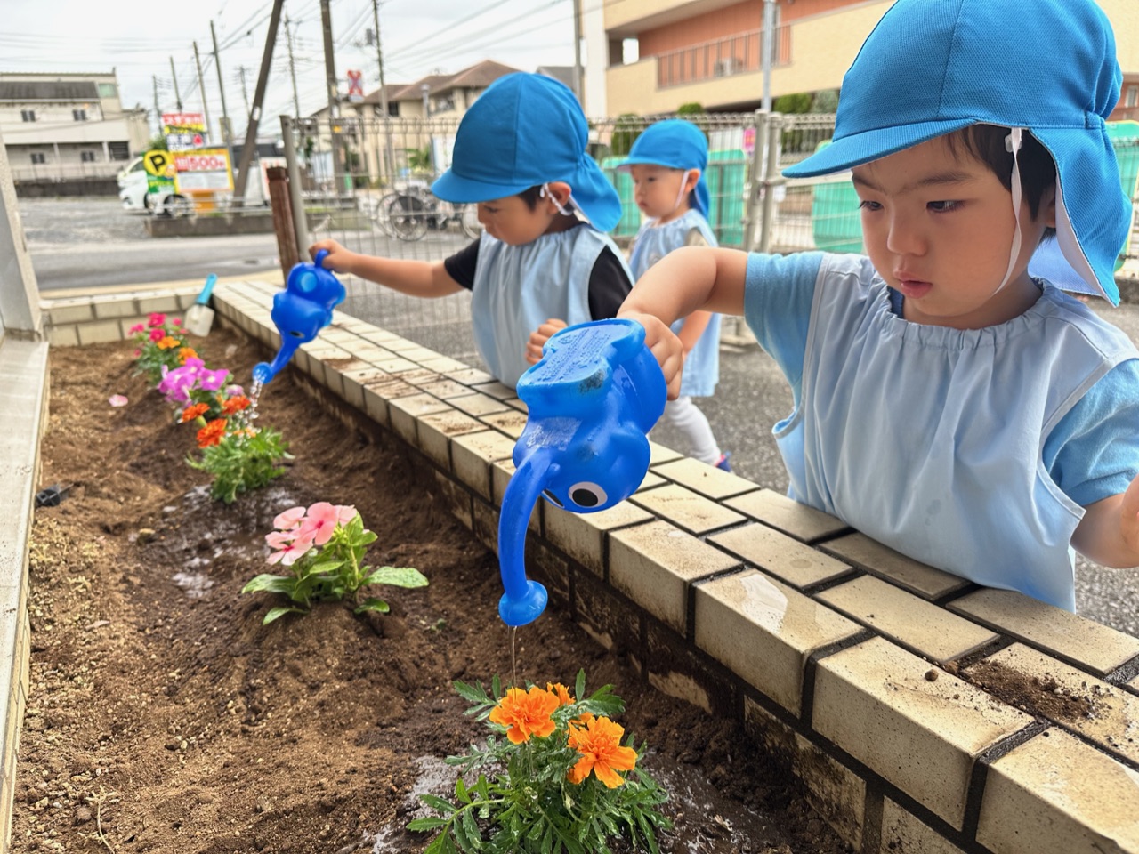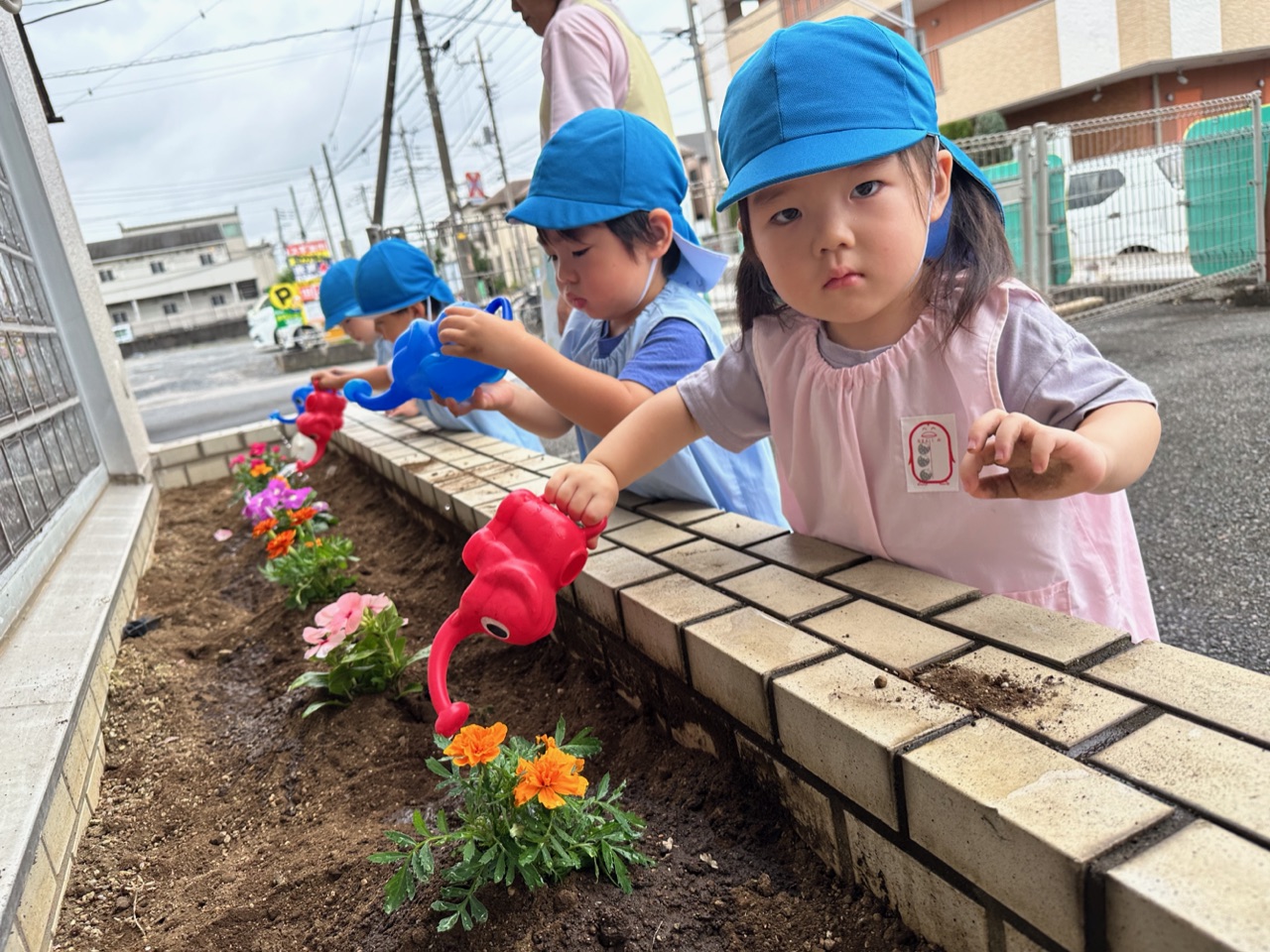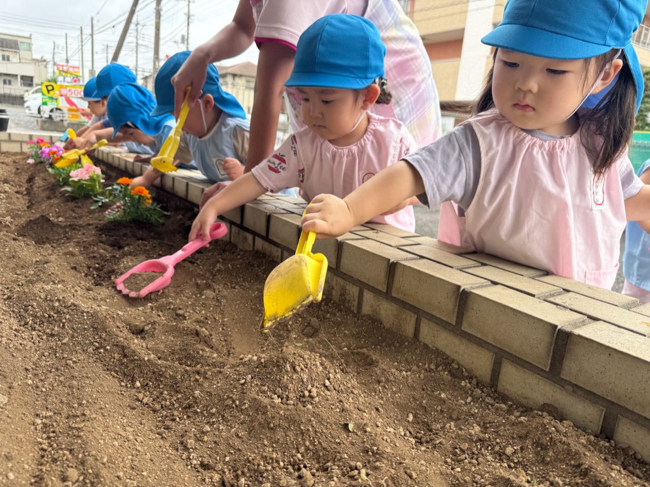 こあら組さんは雨が止んでいる間に園庭へ行き、お花を植えました🌼