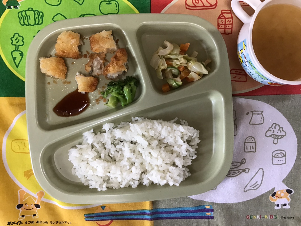 白身魚のフライ、ブロッコリー、和風サラダ、ご飯、みそ汁