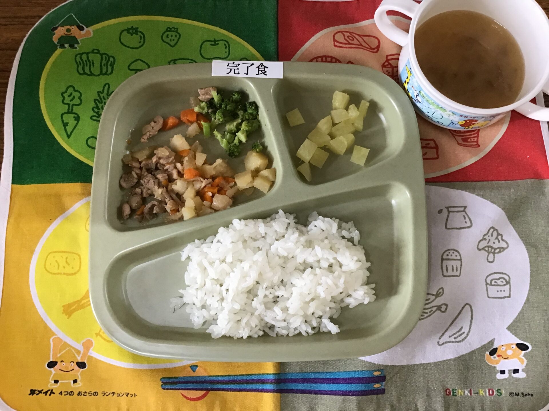肉じゃが、ブロッコリーのごま生ナムル、パイン缶、ごはん、みそ汁