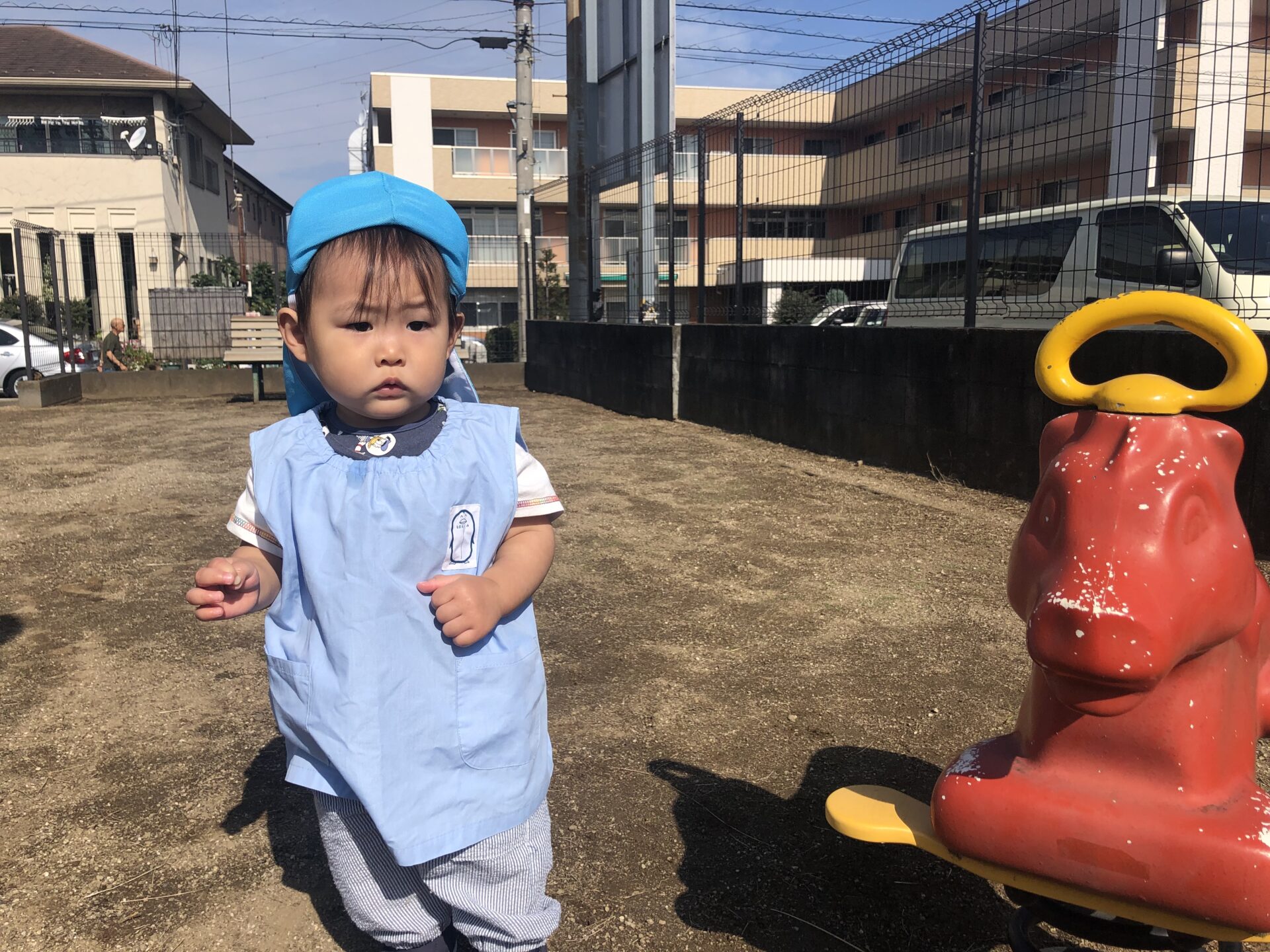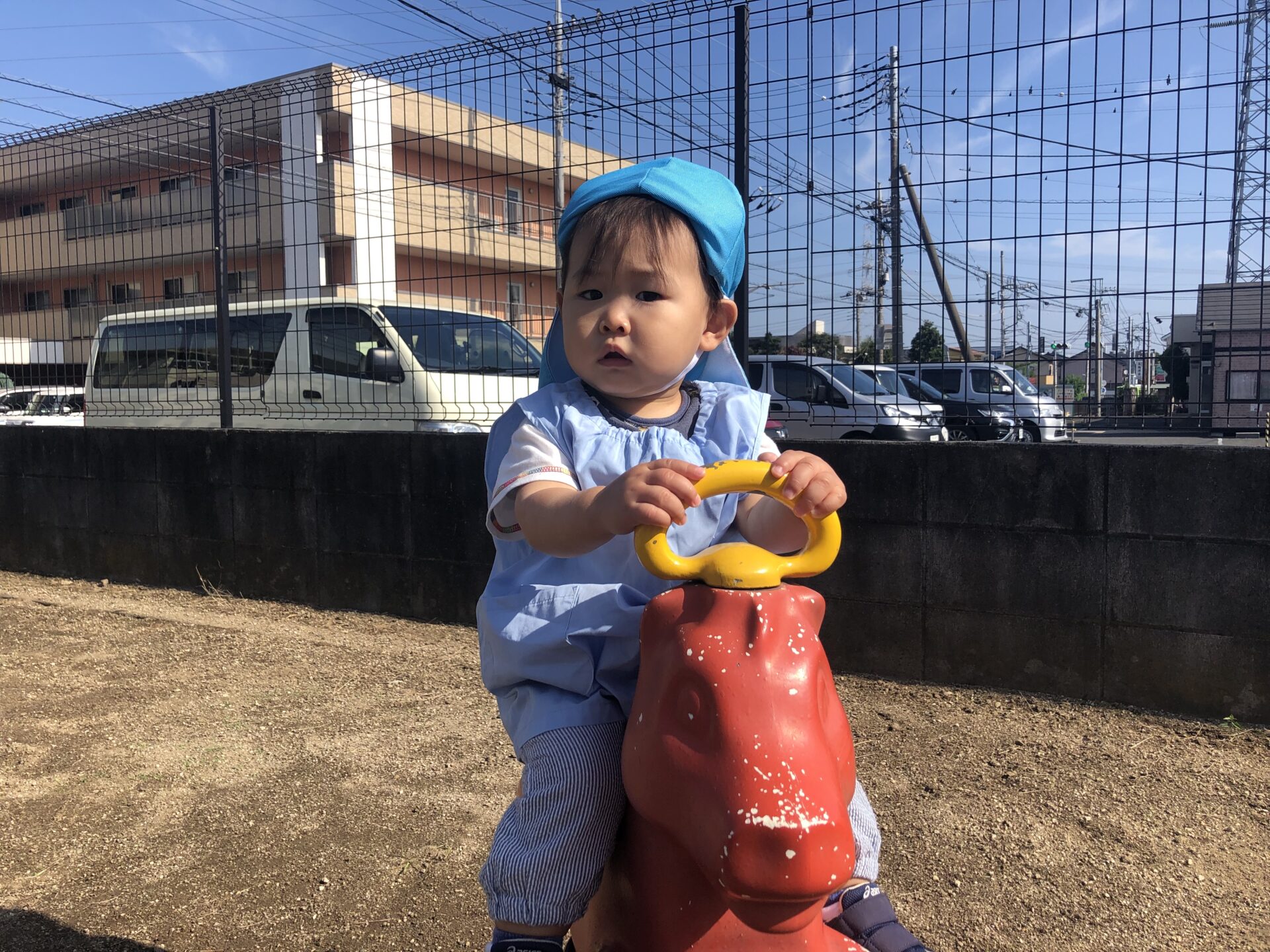 スプリング遊具の馬に乗ったり アリを見つけたりしましたよ。公園の前の道路をバスや救急車が通ると大喜び😃でしたよ。