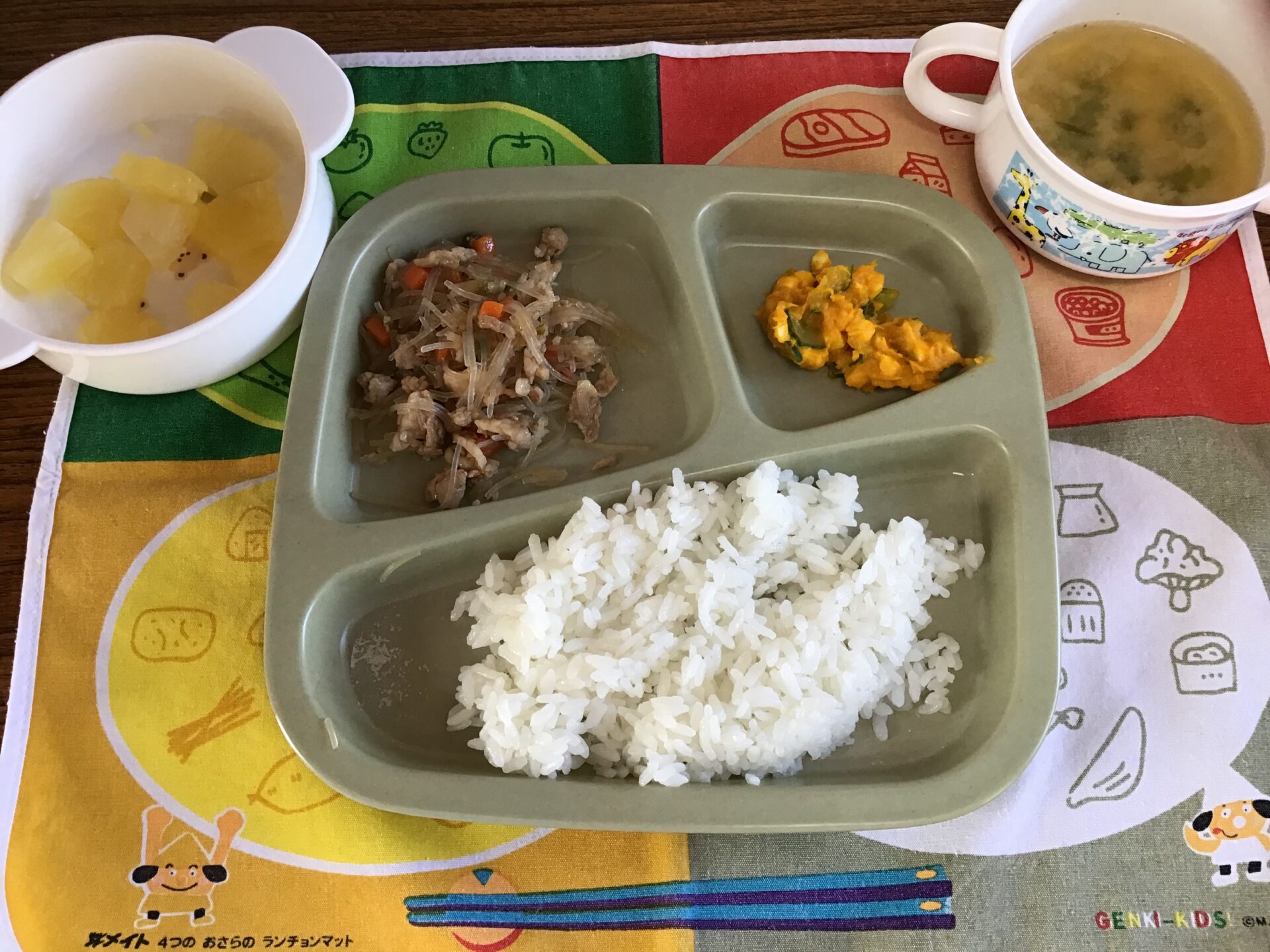 チャプチェ・かぼちゃとチーズのサラダ・パイン缶・ごはん・みそ汁