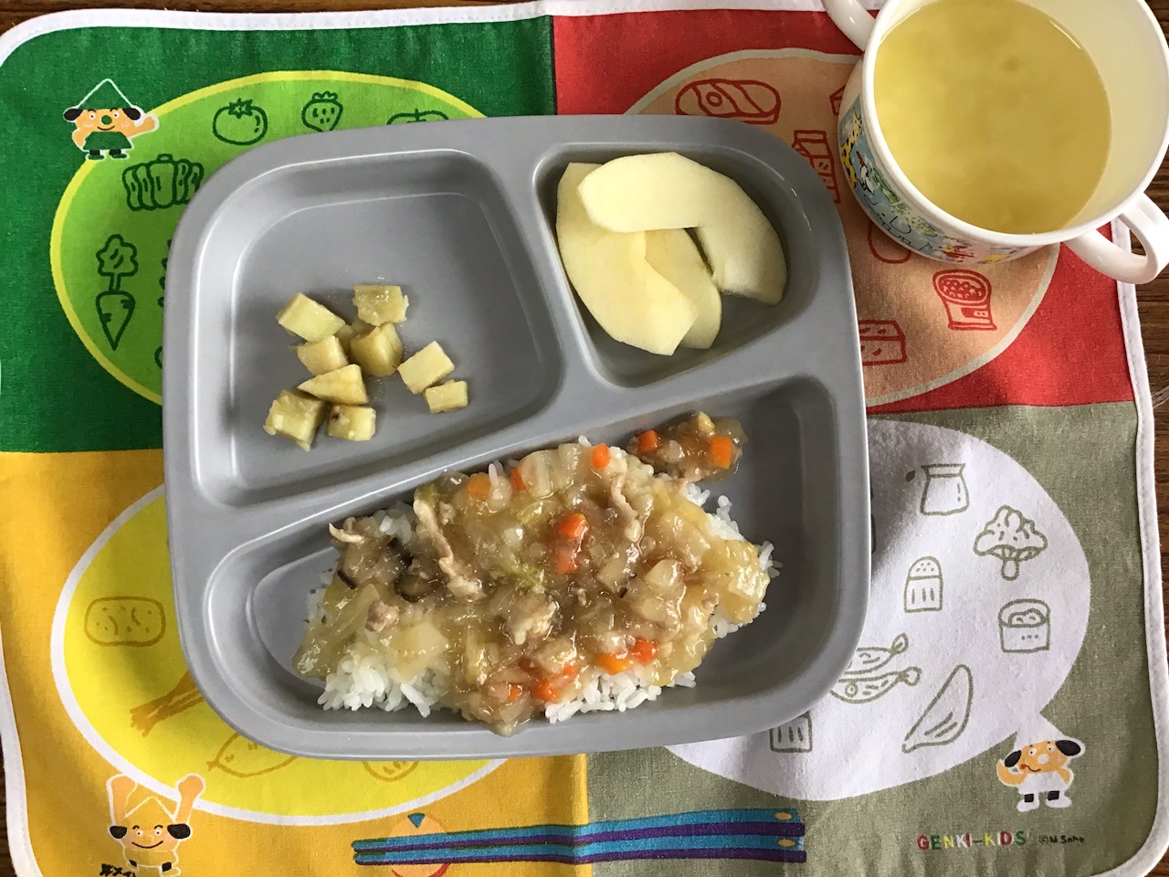 ・中華丼・さつまいもの甘煮・スープ・りんご