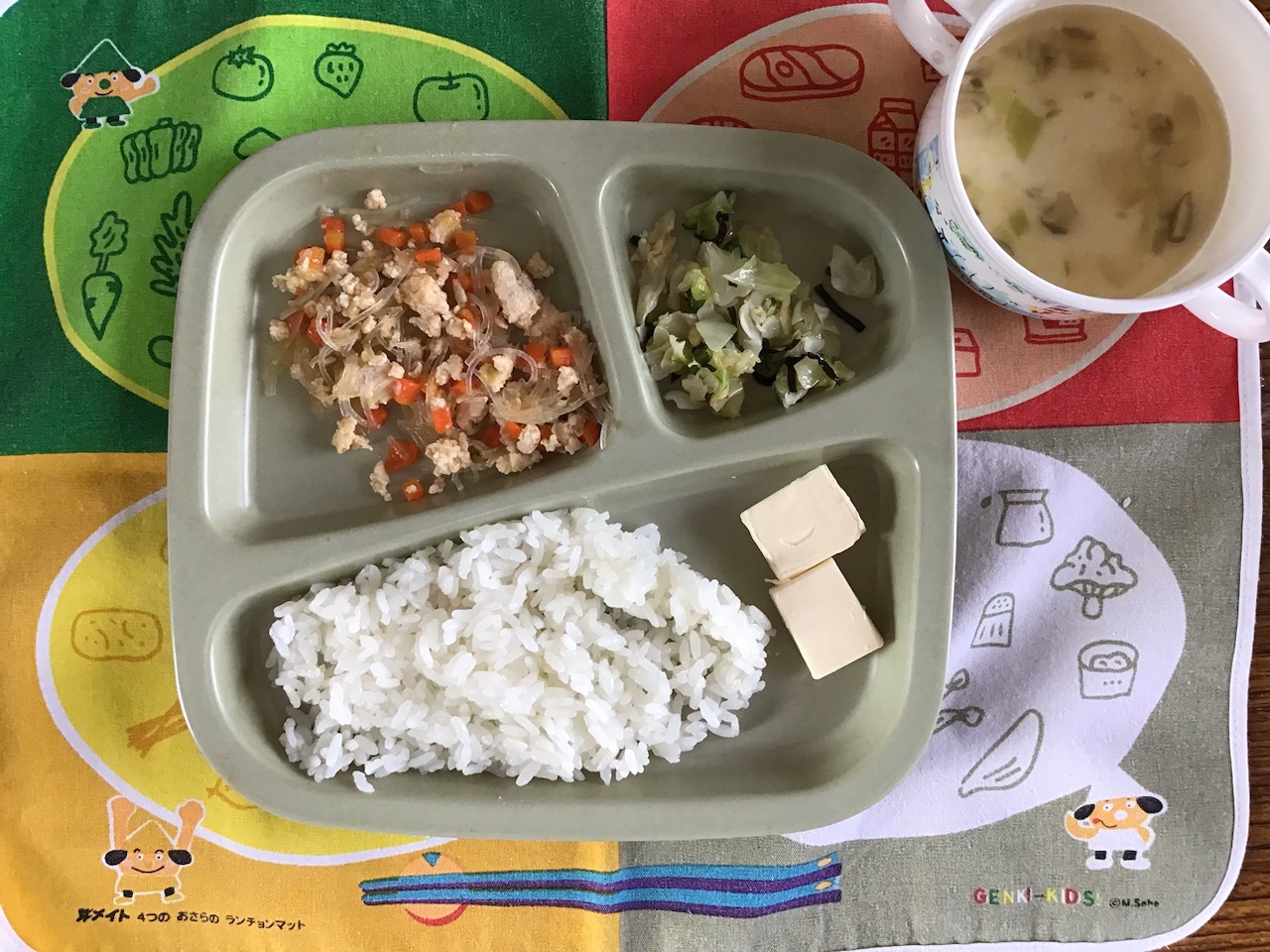 ・挽肉と春雨の炒め・野菜の塩昆布和え・チーズ・ごはん・スープ
