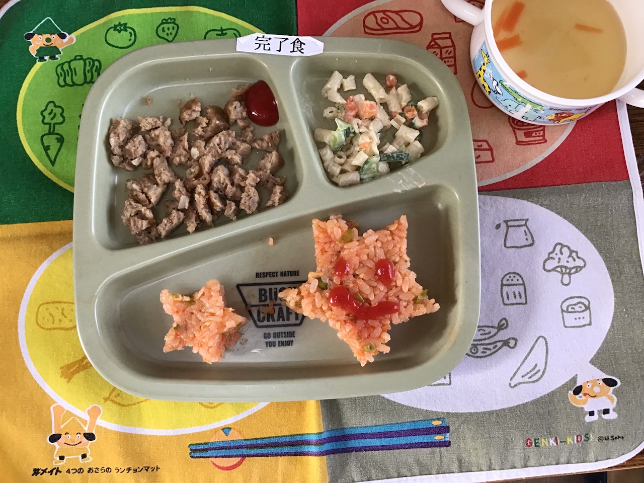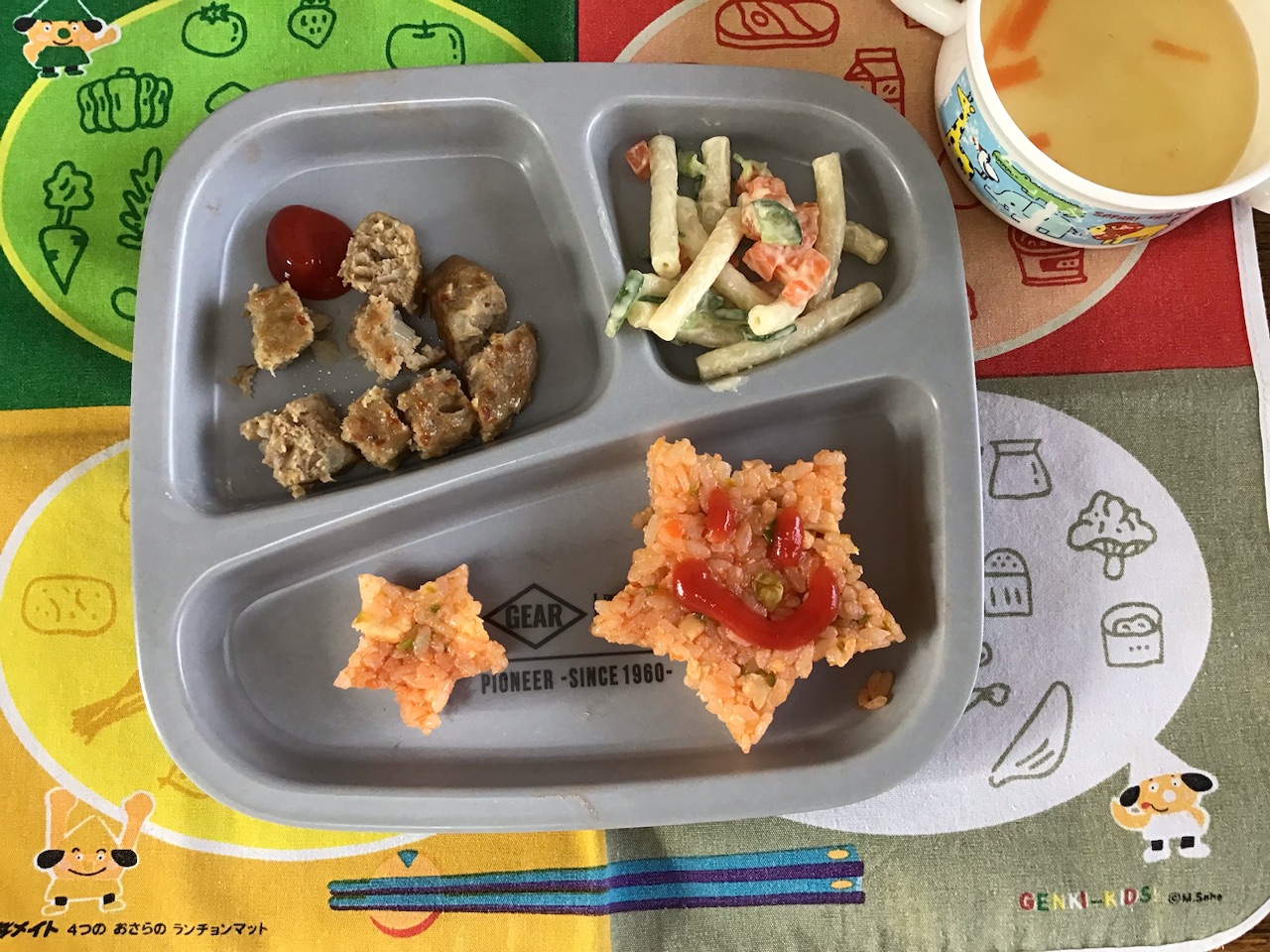・星型ケチャップライス・ハンバーグ・マカロニサラダ・スープ