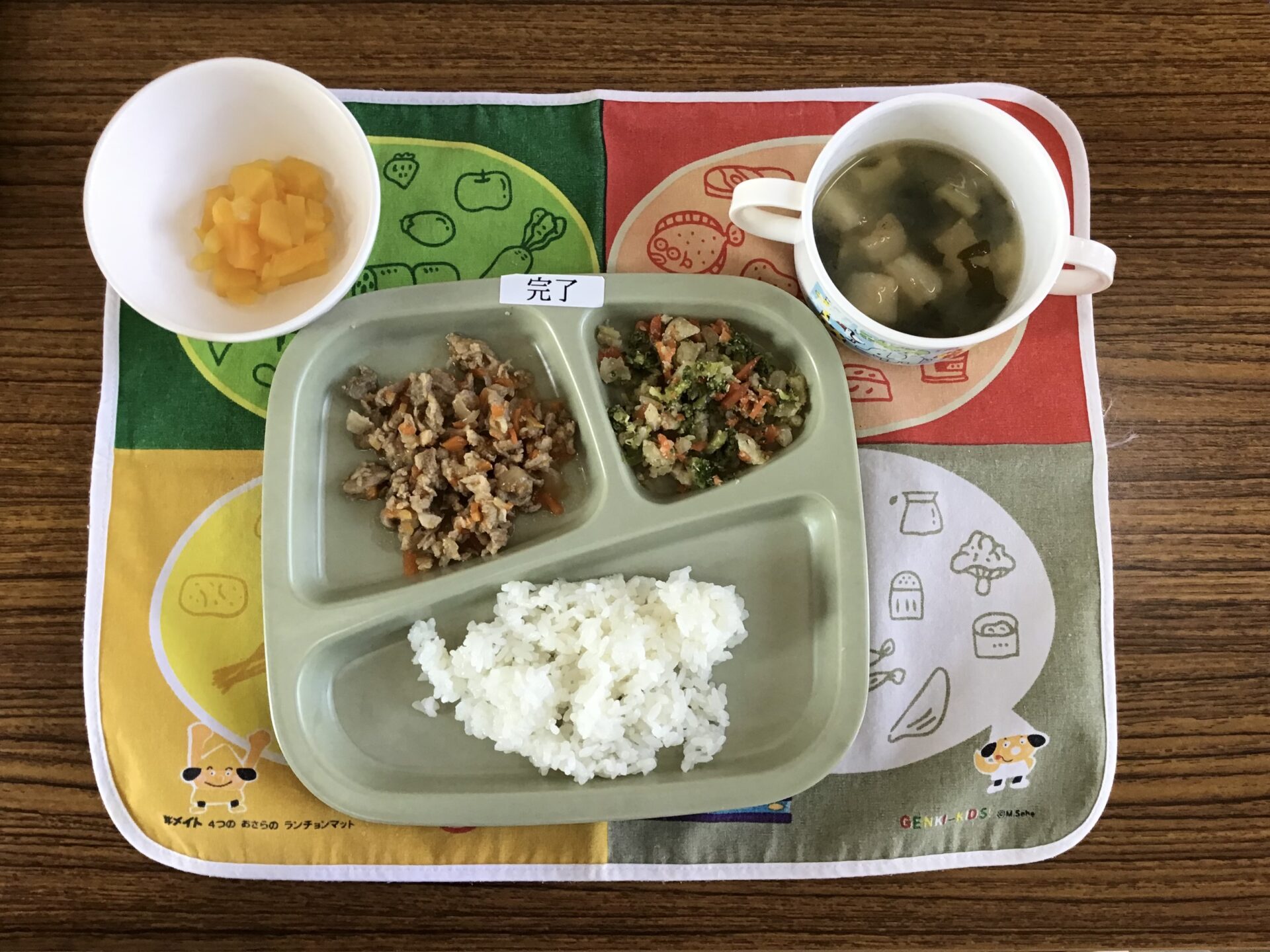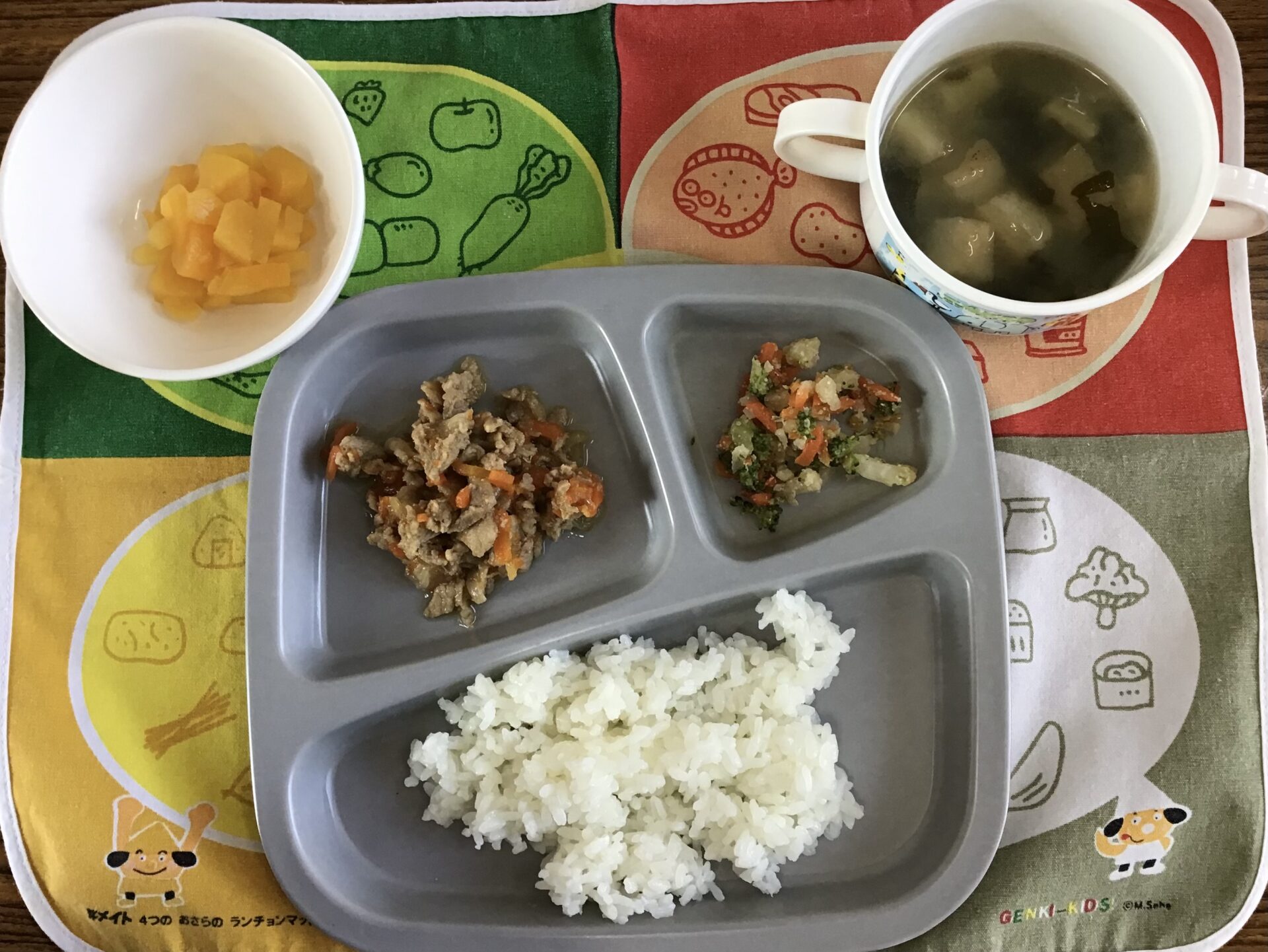 豚肉の生姜焼き、花野菜の胡麻和え、黄桃缶、ごはん、みそ汁