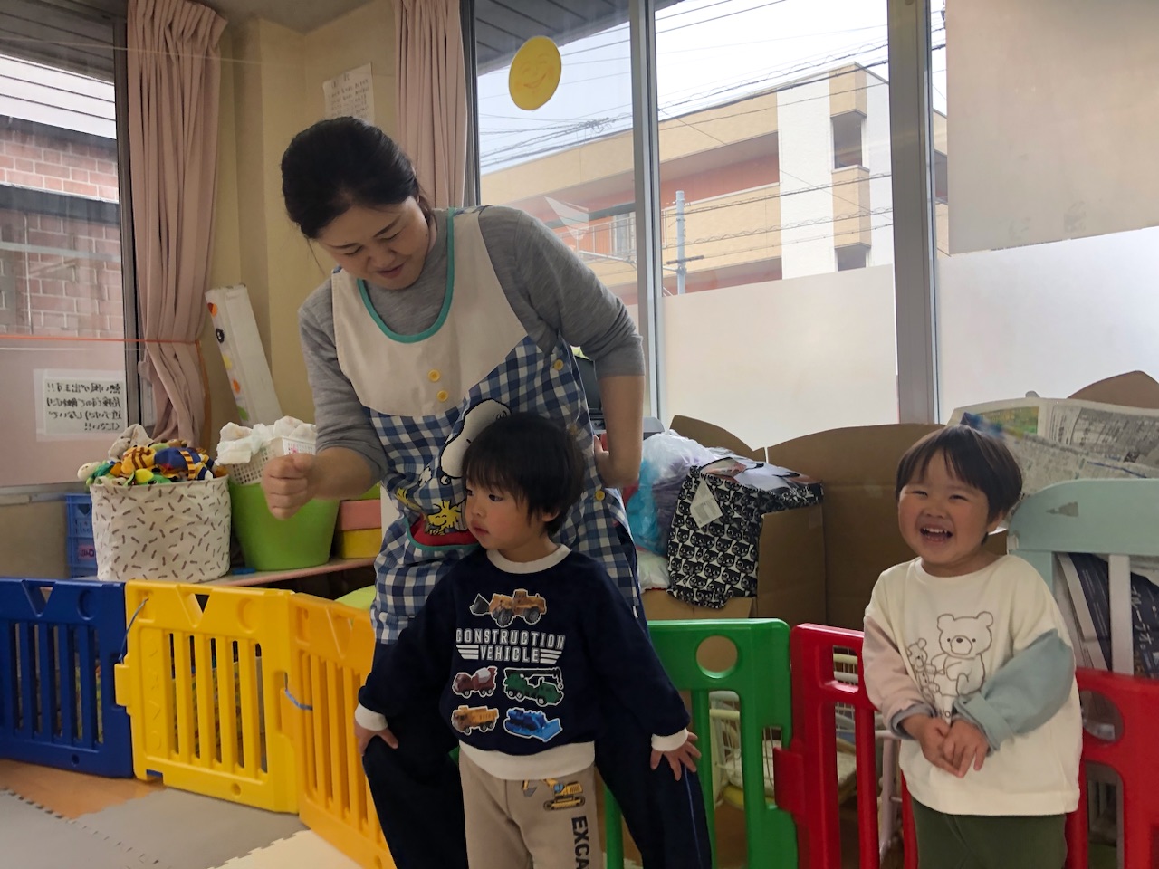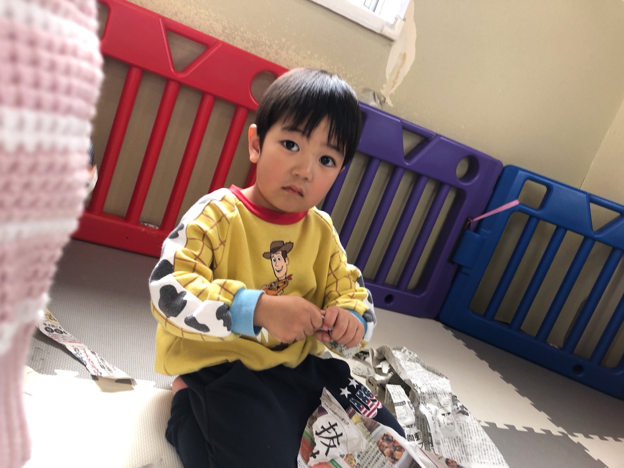 今日は午前中はお天気がイマイチだったので、お部屋で体操したり、新聞紙をビリビリして遊びましたよ^ – ^